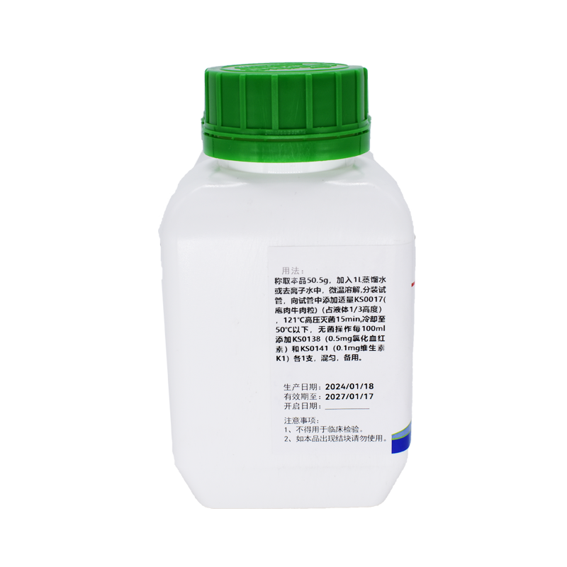 稱取本品50.5g,加入1L蒸餾水中或去離子水中,微溫溶解,分裝試管,向試管中添加適量KS0017(庖肉牛肉粒)(占液體1/3高度),121℃高壓滅菌15min,冷卻至50℃以下,無菌操作每100ml添加KS0138(0.5mg氯化血紅素)和KS0141(0.1mg維生素K1)各1支,混勻,備用。