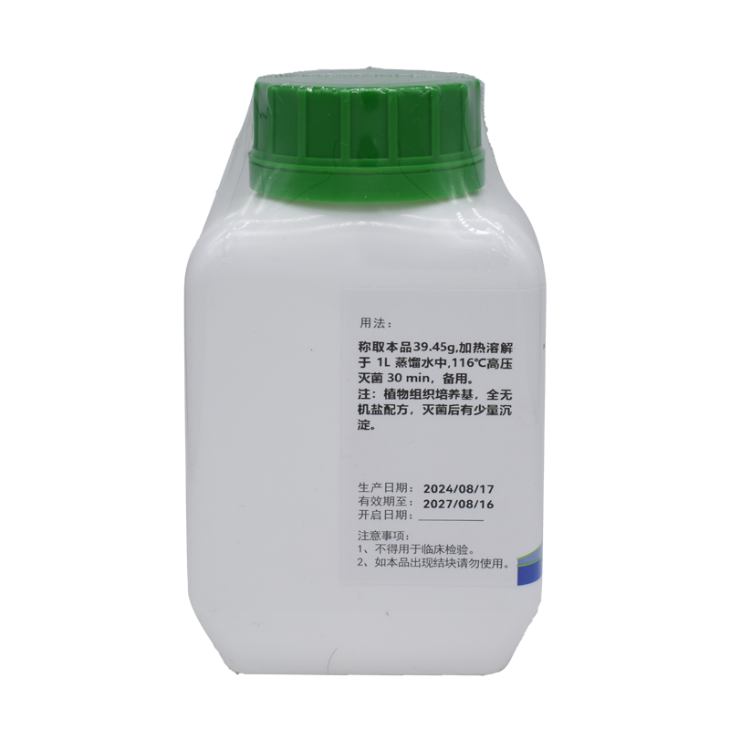 稱(chēng)取本品39.45g,加熱溶解于 1L 蒸餾水中,116°C高壓滅菌 30 min,備用。注:植物組織培養(yǎng)基,全無(wú)機(jī)鹽配方,滅菌后有少量沉淀。