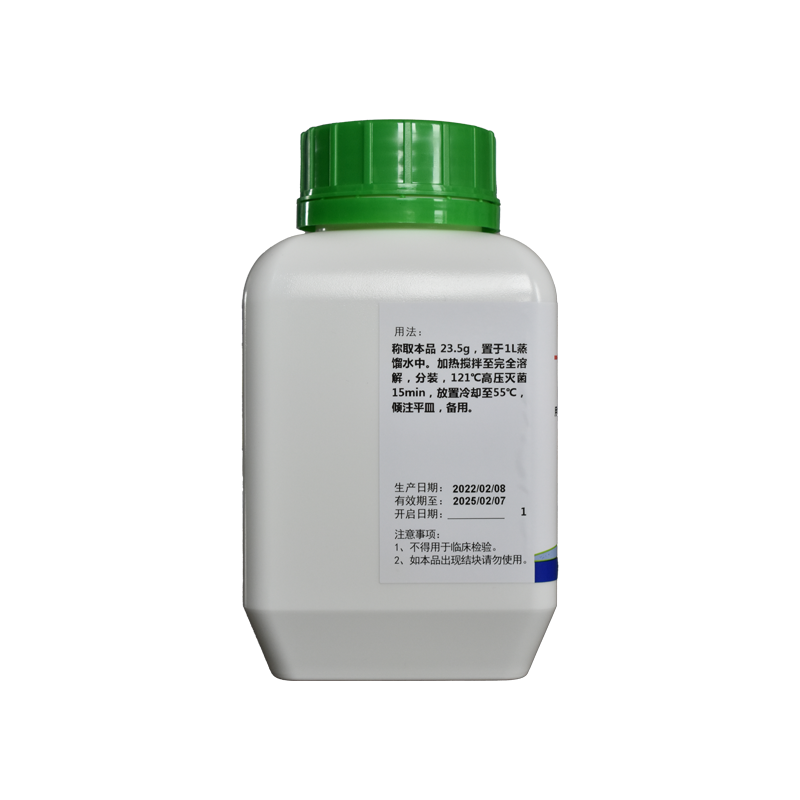 稱取本品23.5g,置于1L蒸餾水中。加熱攪拌至完全溶解,分裝,,121℃高壓滅菌15min,放置冷卻至55℃,傾注平皿,備用。