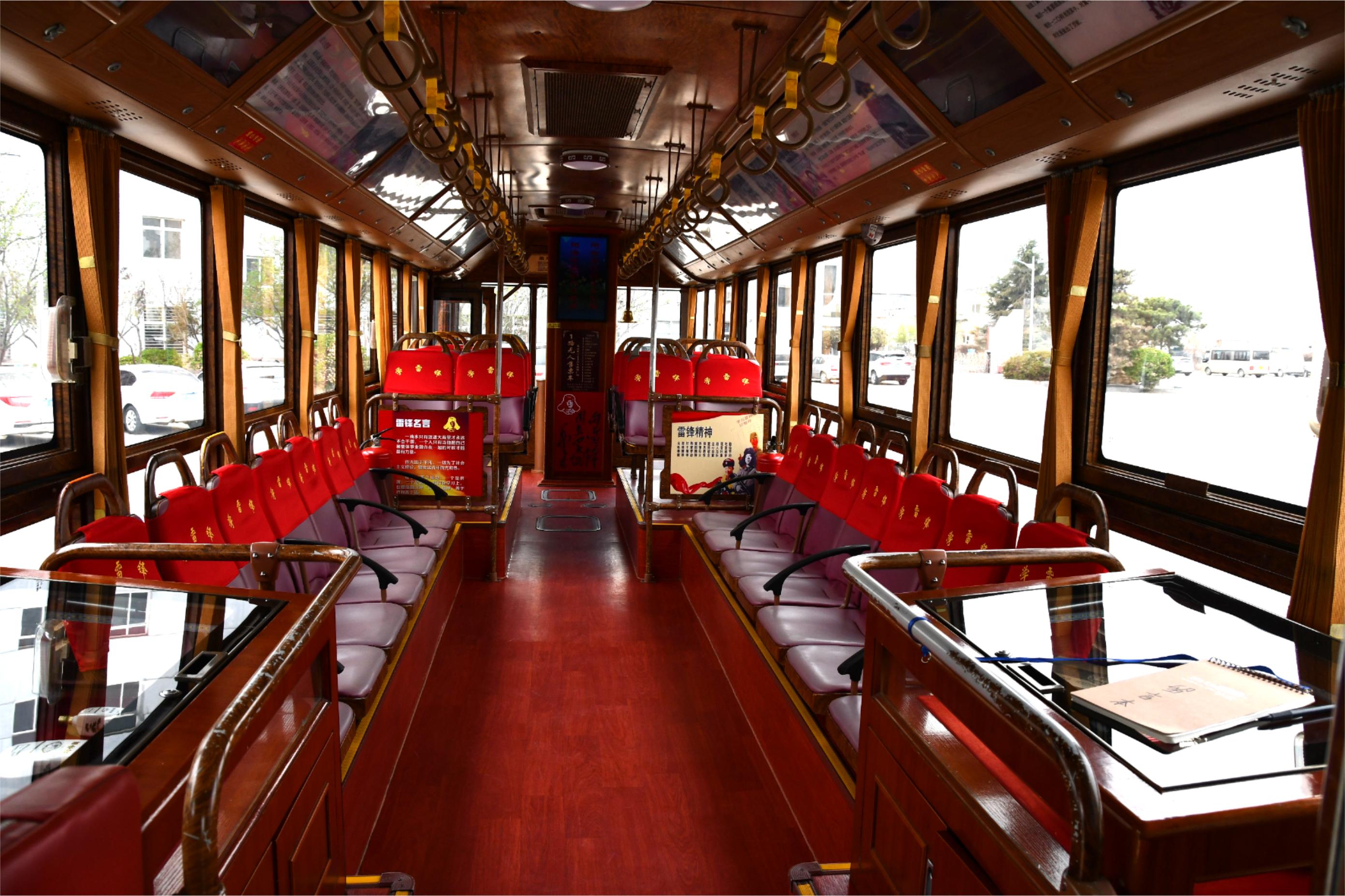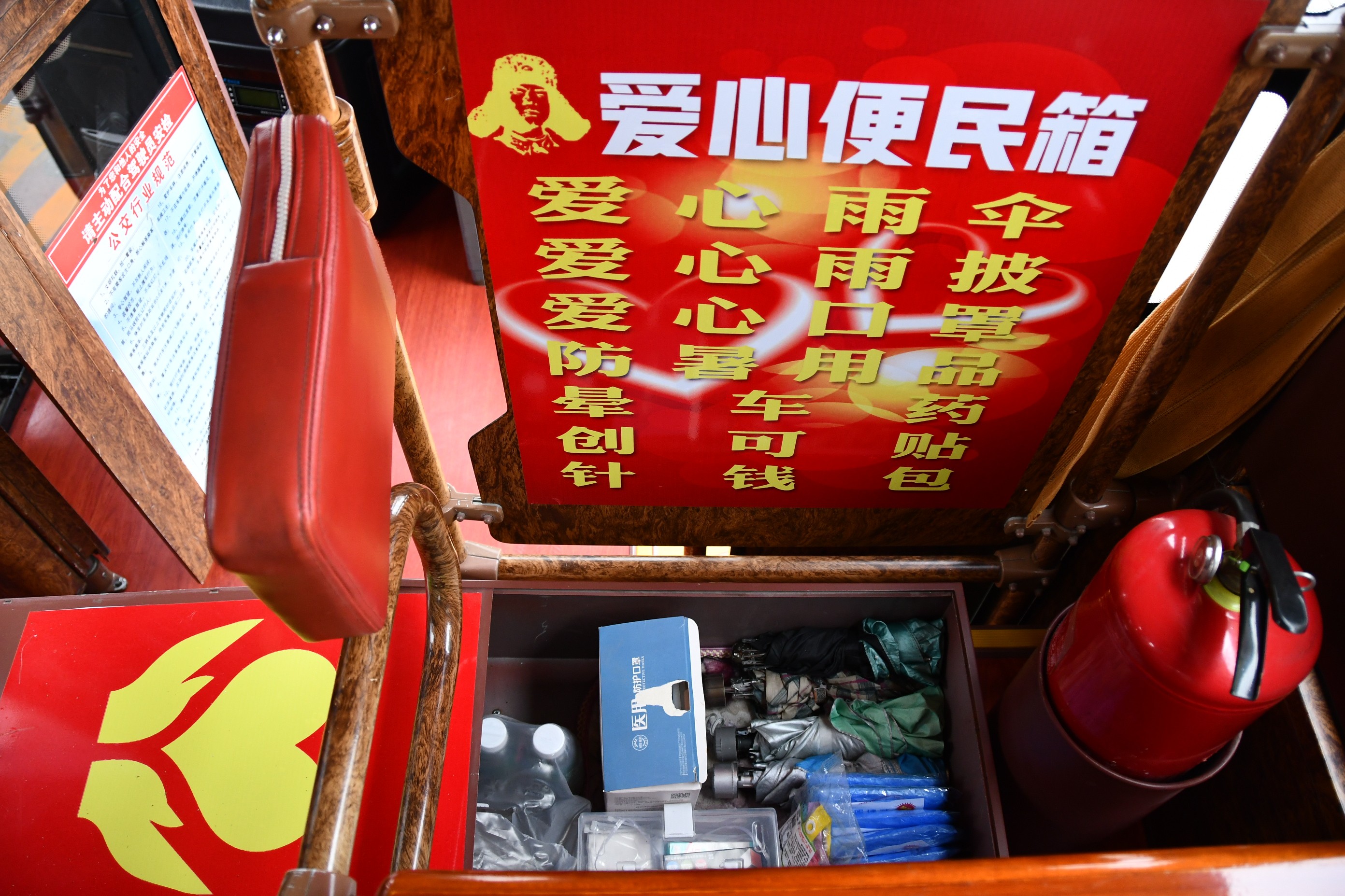 走進(jìn)紅色的鐺鐺車廂,人們仿佛走進(jìn)學(xué)習(xí)雷鋒精神,弘揚勞動精神、工匠精神的“流動課堂”。首先映入眼簾的便是“向雷鋒同志學(xué)習(xí)”“雷鋒名言”“雷鋒精神”等宣傳海報,讓人一上車就有種耳目一新的感覺,加上印有“學(xué)雷鋒”字樣的座椅套,氛圍感瞬間拉滿。再往里走,帶有愛心標(biāo)志的便民箱里應(yīng)有盡有:雨傘、雨披、暈車藥、針線包、濕紙巾、一次性口罩等應(yīng)急物品一應(yīng)俱全,以備乘客的不時之需。