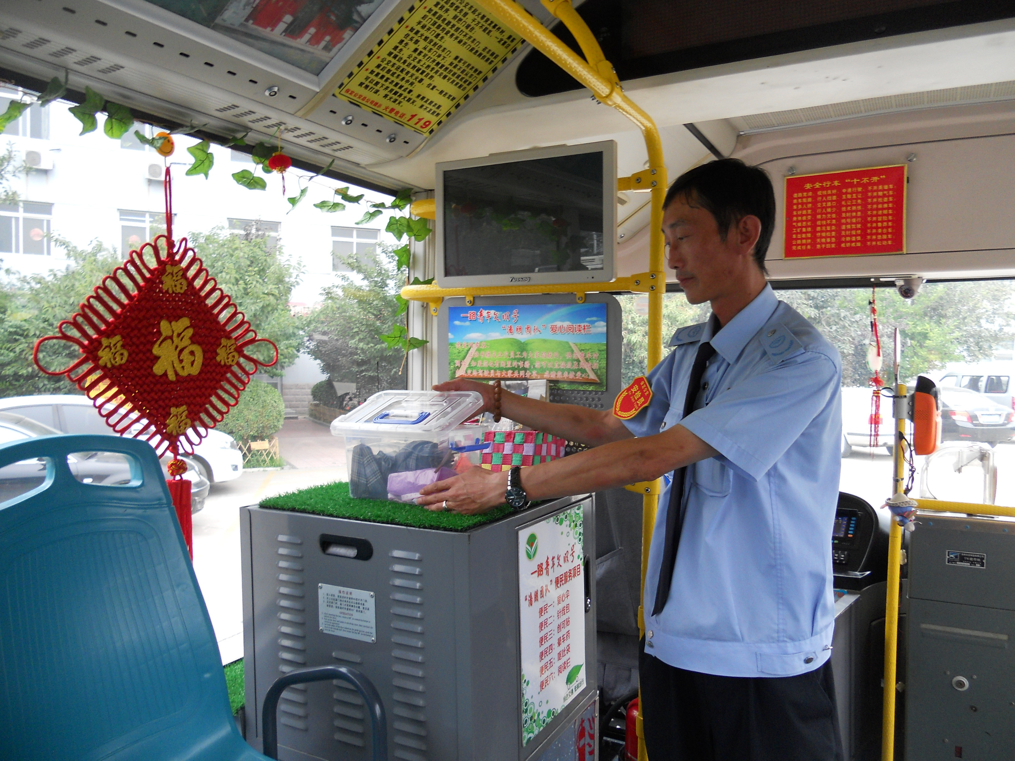 王旭說(shuō):“潘朋是我的師傅,剛?cè)胨疚揖鸵恢备藥煾祵W(xué)習(xí),他把車(chē)廂當(dāng)成家,把乘客視作親人,忘我工作,無(wú)私奉獻(xiàn)的精神,深深感動(dòng)著我?!薄拔乙蚺藥煾祵W(xué)習(xí),要做潘朋式的好司機(jī)”田建軍一邊擦拭駕駛臺(tái)一邊說(shuō)。他們是這樣說(shuō)的也是這樣做的,為了給乘客提供一個(gè)溫馨舒適的乘車(chē)環(huán)境,他們自費(fèi)買(mǎi)來(lái)中國(guó)結(jié)、紅燈籠、小草坪、香料盒美化車(chē)廂,凈化空氣,讓乘客倍感溫馨。