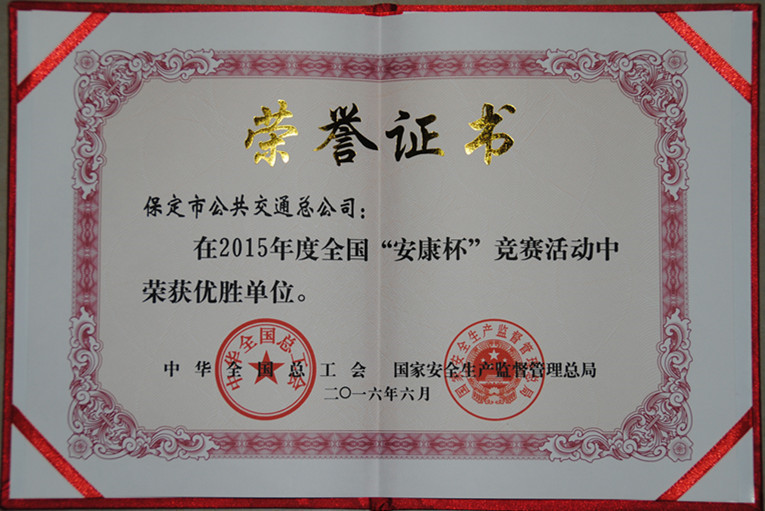 近日,保定公交總公司榮獲由中華全國總工會、國家安全生產(chǎn)監(jiān)督管理總局頒發(fā)的全國“安康杯”競賽優(yōu)勝集體獎牌。
