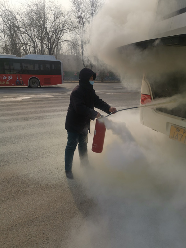 當(dāng)天下午13點(diǎn)25分左右,保定公交第二公司帶班長(zhǎng)施廣泉下班看到客運(yùn)中心裕華東路與東二環(huán)交叉口附近有一輛大巴車冒著滾滾濃煙,隱約還能看到竄出的火苗,一人正焦急地在路邊攔截過(guò)往車輛尋求幫助,施廣泉深感情況危急立即上前幫忙,恰巧此時(shí)衛(wèi)斌駕駛52路公交車迎面駛來(lái),也看到了起火的大巴車,剛要靠邊停車前去救援,施廣泉便沖到車前,于是兩人各拿起一個(gè)車上的滅火器迅速跑向著火車輛。