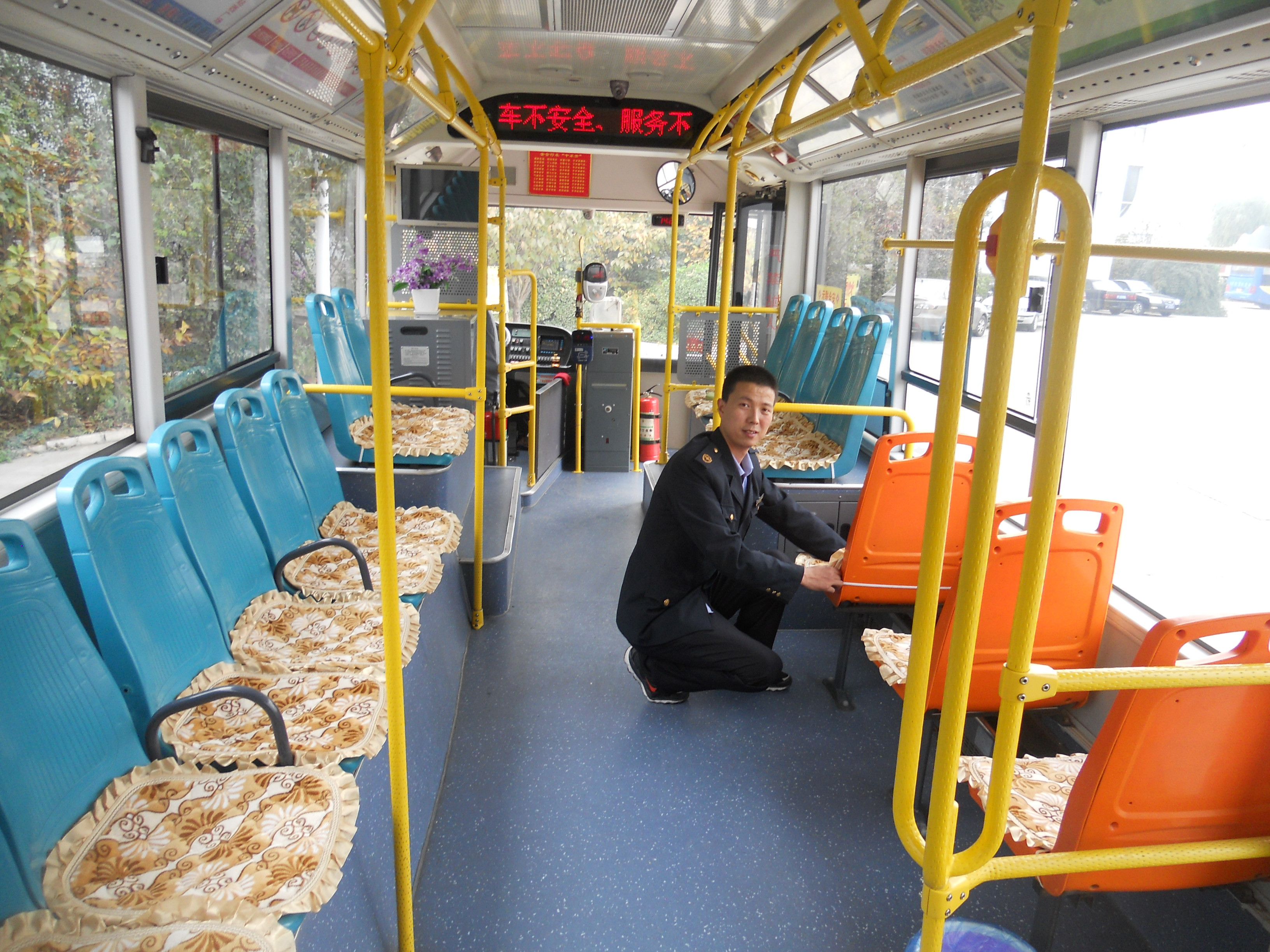潘朋熱愛駕駛員崗位,把乘客的冷暖記在心上,他把車廂當(dāng)作自己的家一樣愛護(hù),把乘客視作親人。金秋十月,天氣轉(zhuǎn)冷,氣溫下降,車內(nèi)座椅乘客入座已感寒涼,而距離空調(diào)開放還有一段時間,為了讓乘客在寒意漸濃的深秋體會到乘車的溫暖,潘朋利用業(yè)余時間自掏腰包購買棉坐墊30個和部分皮筋,逐個縫好,整齊的擺放在座椅上,黃色的坐墊配以楓葉的圖案,精致淡雅,充滿家的親切和溫馨,讓每一位乘客從一張小小的坐墊中感受到公交服務(wù)的貼心和溫暖。有人問潘朋:“你掙錢不多,車也不是自己的,干嘛花這么多錢買坐墊呢”,他回答說:“不在花錢多少,只要乘客坐著舒服,對咱們的服務(wù)滿意就行了”。樸實的話語折射出潘朋作為一名普通公交駕駛員對崗位的熱愛,對乘客的愛心以及對企業(yè)的忠誠。從2013年至2015年,潘鵬連續(xù)三年自費為乘客購買“愛心坐墊”,三年間,《燕趙都市報》、《保定晚報》、《保定日報》分別以“1路車的“愛心座墊”很暖心“為題,跟蹤報道潘朋自購椅墊為乘客送去暖心服務(wù)的感人事跡。