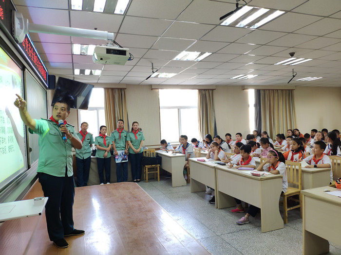 一早,師生們就在綠草如茵的操場(chǎng)上迎接公交志愿宣講隊(duì)的到來(lái),同學(xué)們?yōu)樾v員們佩戴鮮艷的紅領(lǐng)巾,并聘請(qǐng)他們?yōu)椤靶M廨o導(dǎo)員”,宣講員李娟進(jìn)行了發(fā)言。隨后,公交宣講員跟隨師生們來(lái)到電教室,開(kāi)始了一堂生動(dòng)有趣的安全文明乘公交專(zhuān)題課。