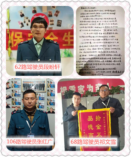 同樣,另一件令人感動(dòng)的事發(fā)生在68路駕駛員祁文雪的身上。11月21日下午,一位六旬老人乘坐68路,下車時(shí)不慎將裝有手機(jī)、身份證、戶口本以及8000元現(xiàn)金等物品的皮包落在了公交車上,被祁文雪發(fā)現(xiàn)后妥善保管起來,并及時(shí)歸還給失主。此外還有撿到乘客丟失物品及時(shí)歸還的501路駕駛員鄭玉鵬、39路駕駛員張敬磊、61路駕駛員張金玲;勇于撲救著火道路綠化帶的905路駕駛員張清雨、韓博、孫幸旺、趙曉東、常建剛……